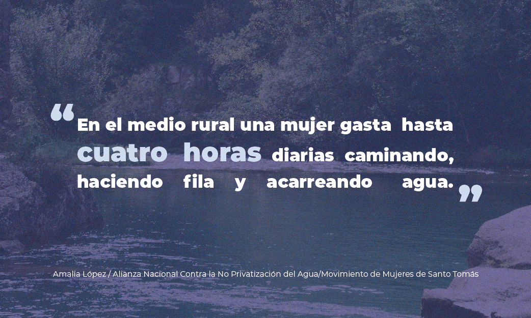 En el medio rural una mujer gasta hasta cuatro horas diarias caminando, haciendo fila y acarreando agua. En este caso, se deja en segundo lugar dedicar ese tiempo a labores orientadas en su propio beneficio, avanzar con tareas domésticas y así como cuidar a sus hijos e hijas. El agua que nosotras las mujeres y las niñas acarreamos, en muchos casos, está contaminada lo que nos pone en situación de riesgo por el contacto directo, pues el agua se utiliza para las labores indirectas de los cuidados como lavar, el aseo del grupo familiar, preparación de alimentos y riego de sus cultivos.