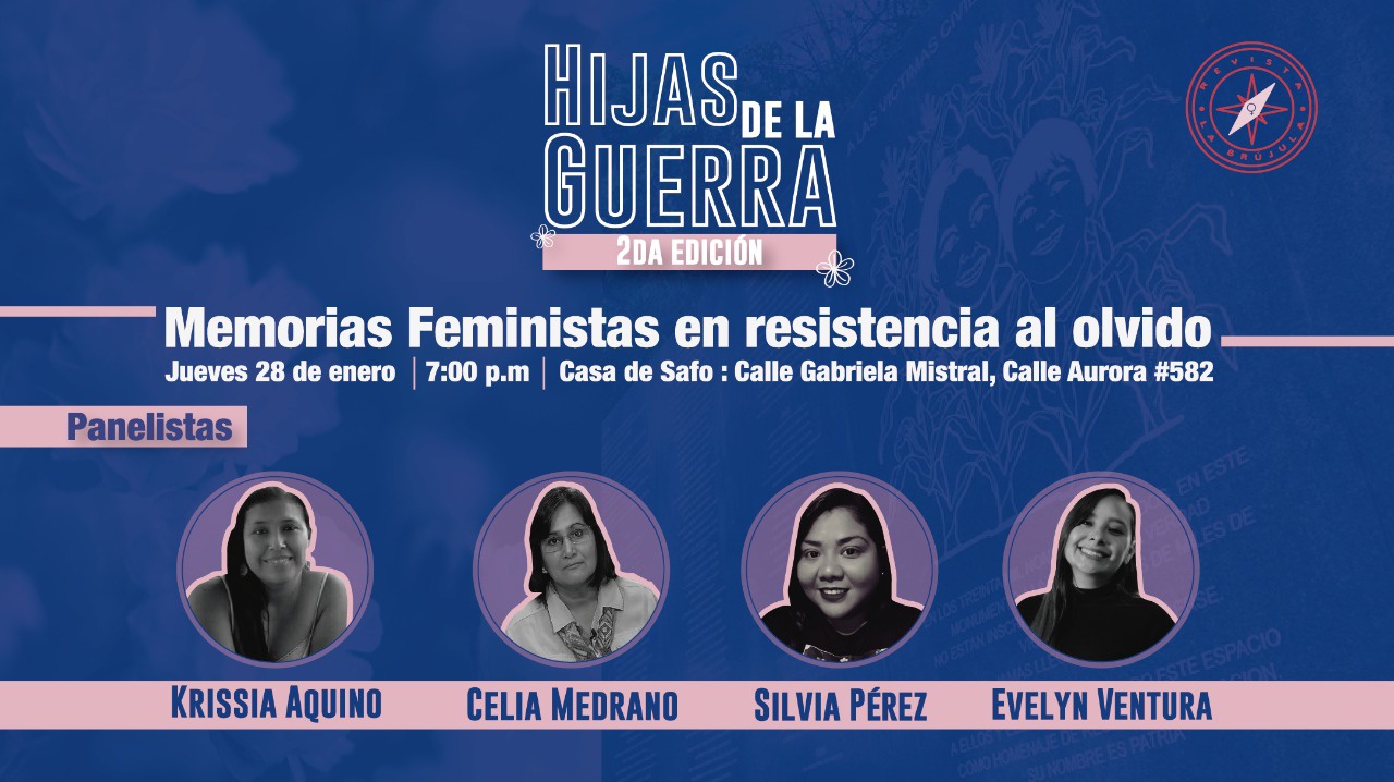Por segundo año consecutivo Revista la Brújula llevó a cabo el conversatorio Hijas de la Guerra con el tema “Memorias feministas en resistencia al olvido». En esta segunda edición se contó con la participación de cuatro panelistas: Krissia Aquino, Celia Medrano, Silvia Pérez y Evelyn Ventura.