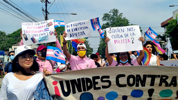 Durante la marcha se leían carteles denunciando los abusos de autoridad durante el régimen de excepción. Un informe de Comcavis Trans y Ormusa revela que el 65% de la población LGBTI señala haber sido discriminada por agentes de autoridad.