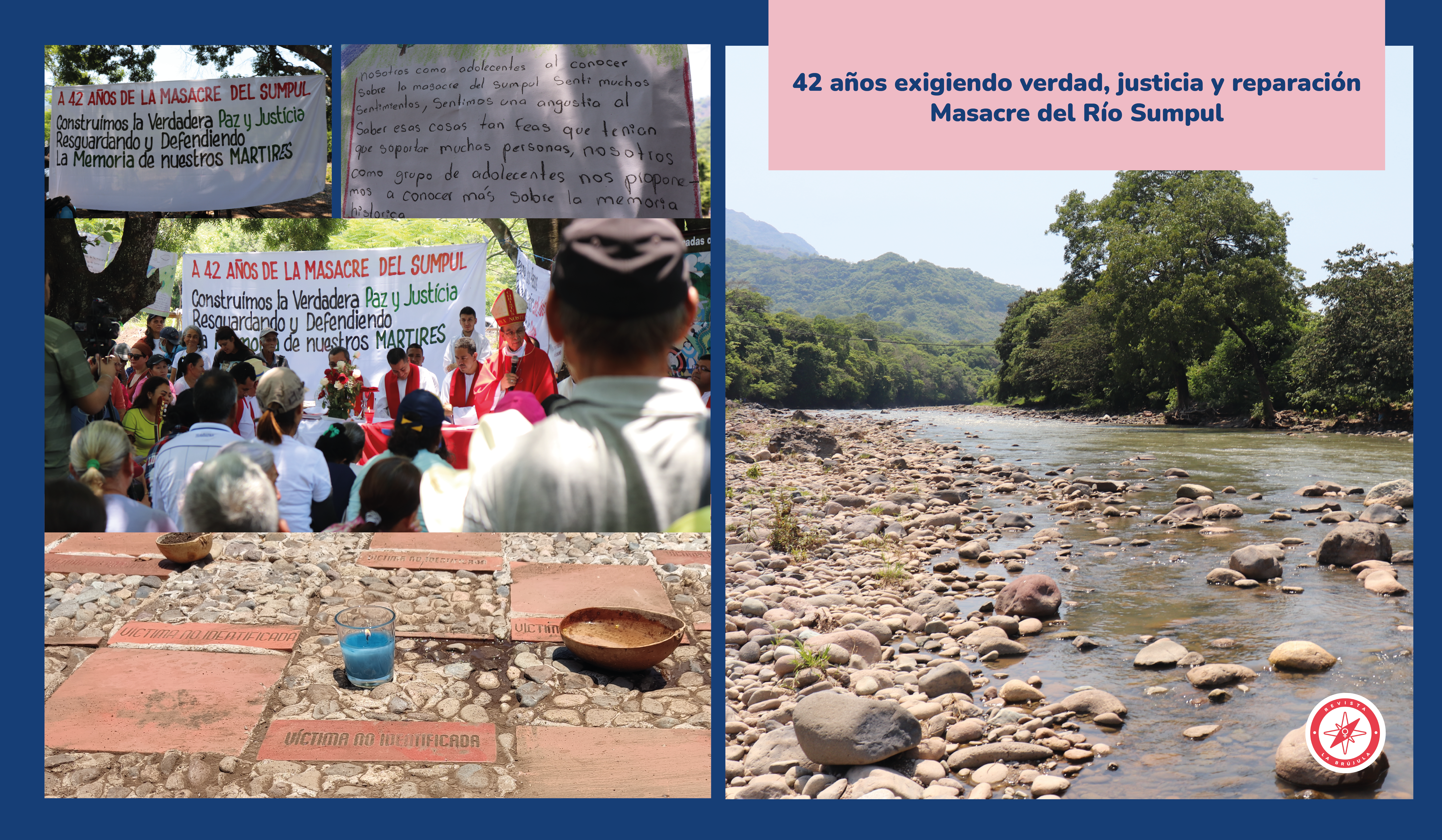 Cientos de personas caminan a través de piedras sueltas, veredas, solares y a las orillas del Río Sumpul para asistir a la conmemoración del 42 aniversario de la masacre ocurrida el 13 y 14 de mayo de 1980. Durante la marcha las abuelas sobrevivientes relatan a quienes las acompañan como recorrieron las montañas para escapar del ejército. Esta peregrinación de sobrevivientes, familiares de víctimas, poblaciones de los alrededores y diferentes representantes de organizaciones parte todos los años hacia el caserío Las Aradas, municipio de Ojos de Agua, Chalatenango.