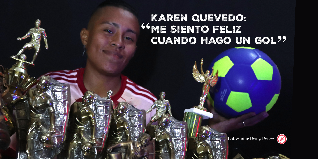 Karen Quevedo es campeona goleadora de diversos torneos, a sus 24 años ha recorrido equipos de la Liga Nacional de Fútbol 7 y Primera División Femenina. Actualmente juega en FAS Femenino como delantera. Considera fundamental el apoyo de su madre y sus amigas para poder ejercer este deporte. Sus goles son dedicados a su madre y a su hijo de siete años.