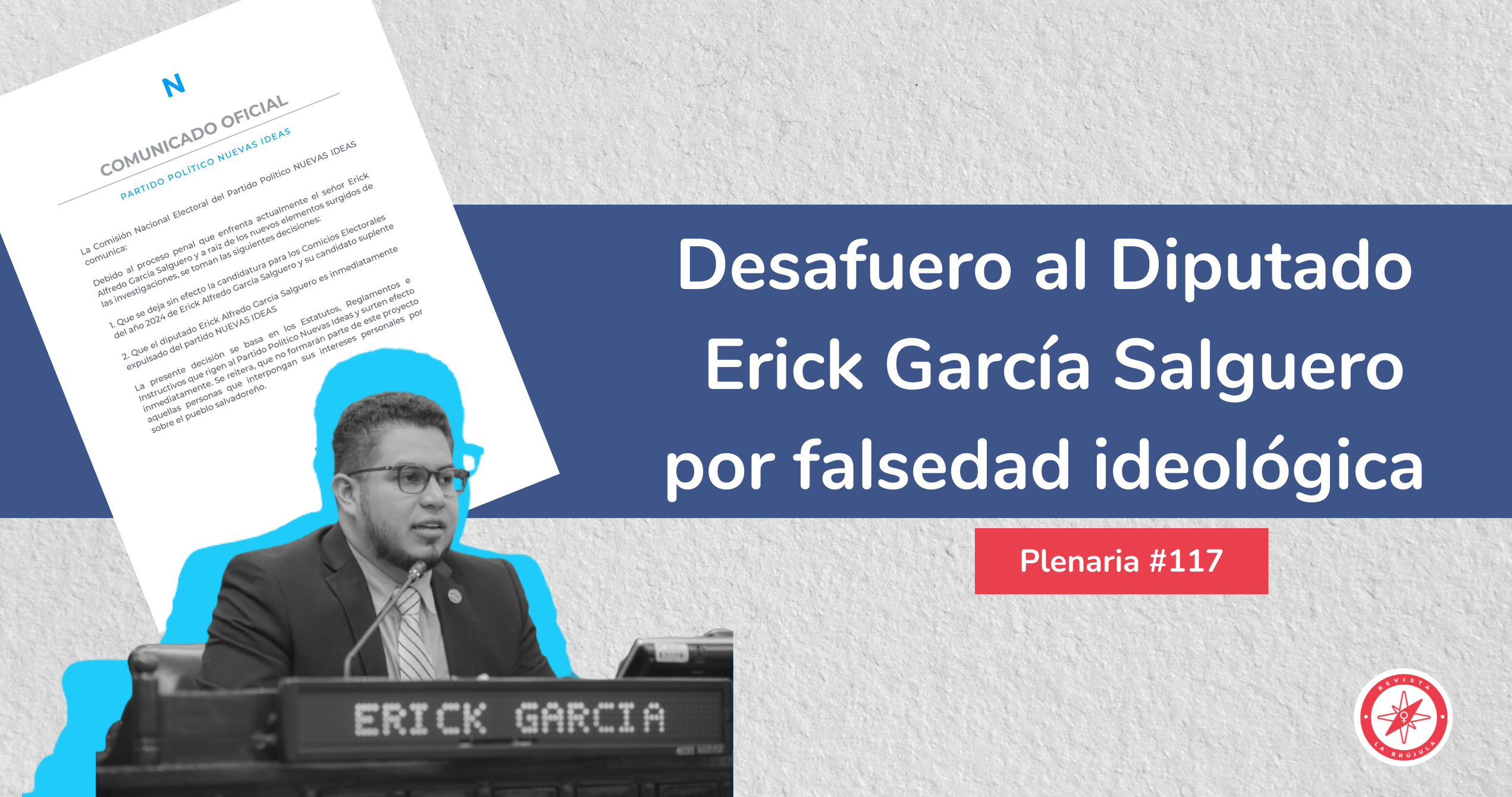 Ayer la Asamblea Legislativa realizó la plenaria 117, previó a ella el Fiscal General, Rodolfo Delgado llegó al salón azul a solicitar la destitución y desafuero del diputado de Nuevas Ideas, Erick García Salguero, a quién se le acusa de falsedad ideológica.
