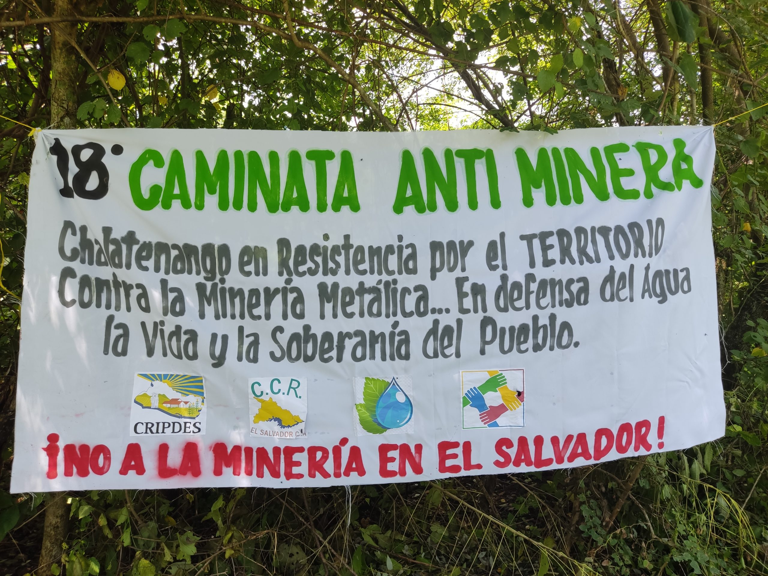 Al otro lado del cerro, en letras grandes se leía “Chalatenango en Resistencia por el Territorio contra la Minería metálica… En defensa del agua, la vida y soberanía del pueblo”.