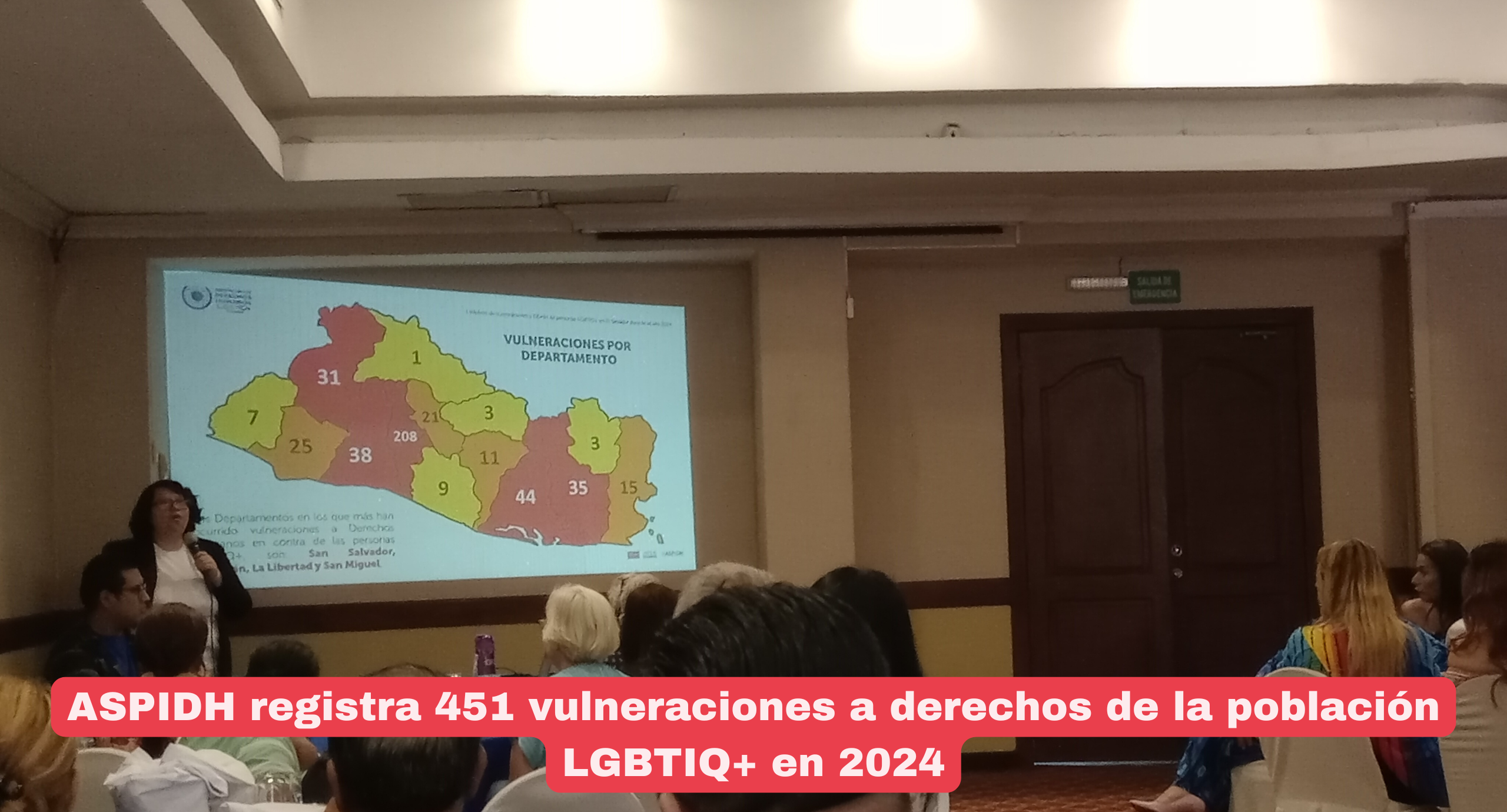 La Asociación Solidaria para Impulsar el Desarrollo (ASPIDH) presentó el «Informe 2024 sobre vulneraciones a los derechos humanos de las personas LGBTIQ+ en El Salvador» con el objetivo de realizar acciones de prevención de estos hechos, que permitan disminuir los registros y, a la vez, acercar la justicia. Además de impulsar la transparencia y encontrar soluciones a las problemáticas sociales.
