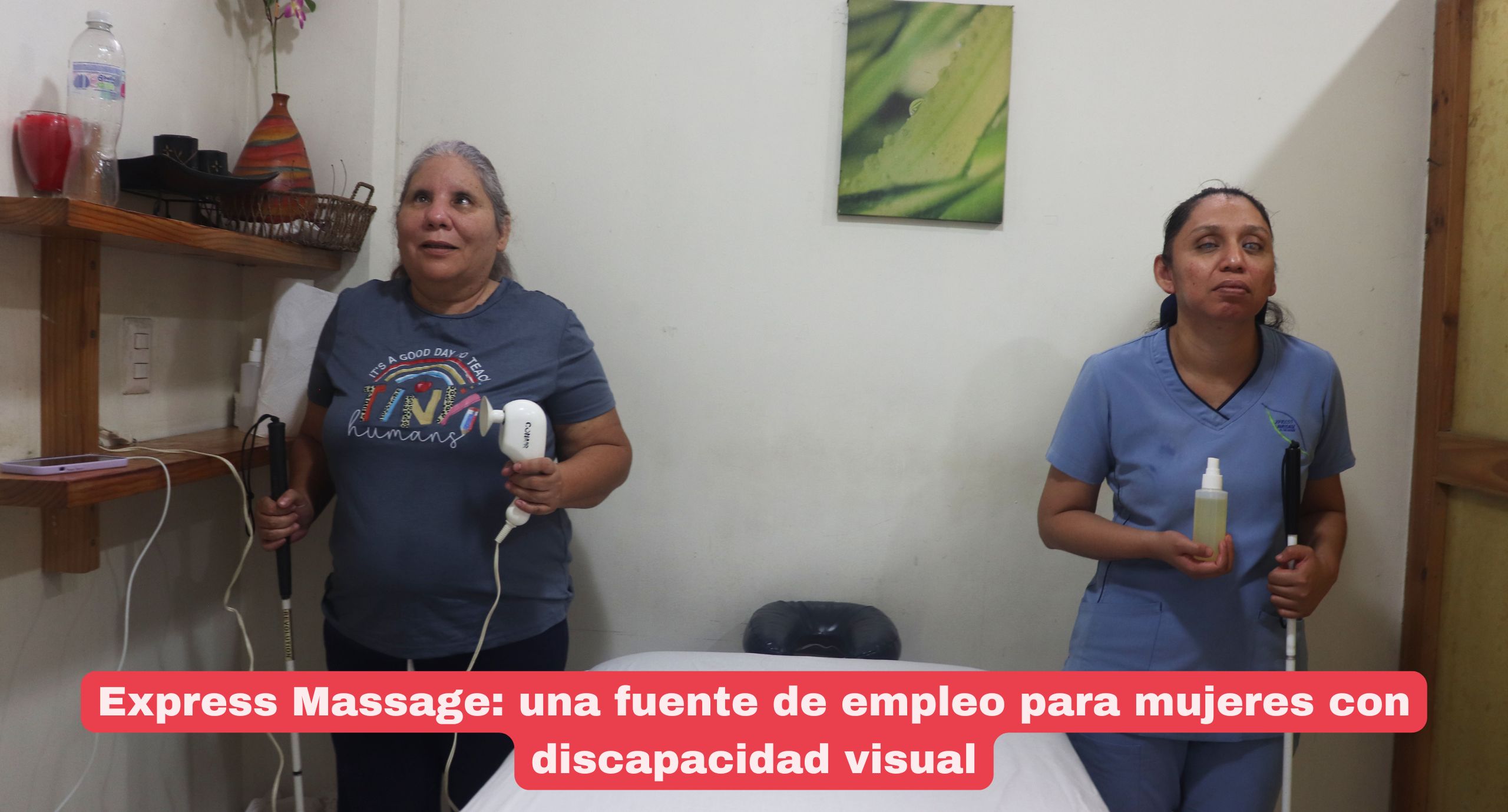 Nancy y Gabriela son dos mujeres con discapacidad visual que forman parte de la clínica Xpress Massage. Desde jóvenes aprendieron a realizar masajes y se han convertido en profesionales de esta área. Sus manos ayudan a aliviar el dolor muscular y el estrés de las personas que acuden a la clínica. Este trabajo se ha convertido en su principal fuente de ingresos y sueñan que crezca para que sea una fuente de empleo para más mujeres con discapacidad.
