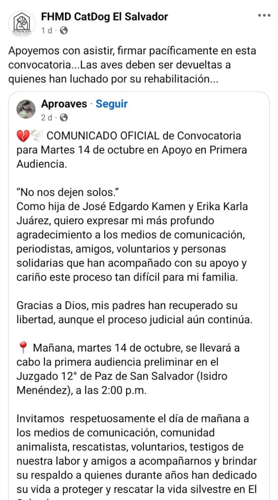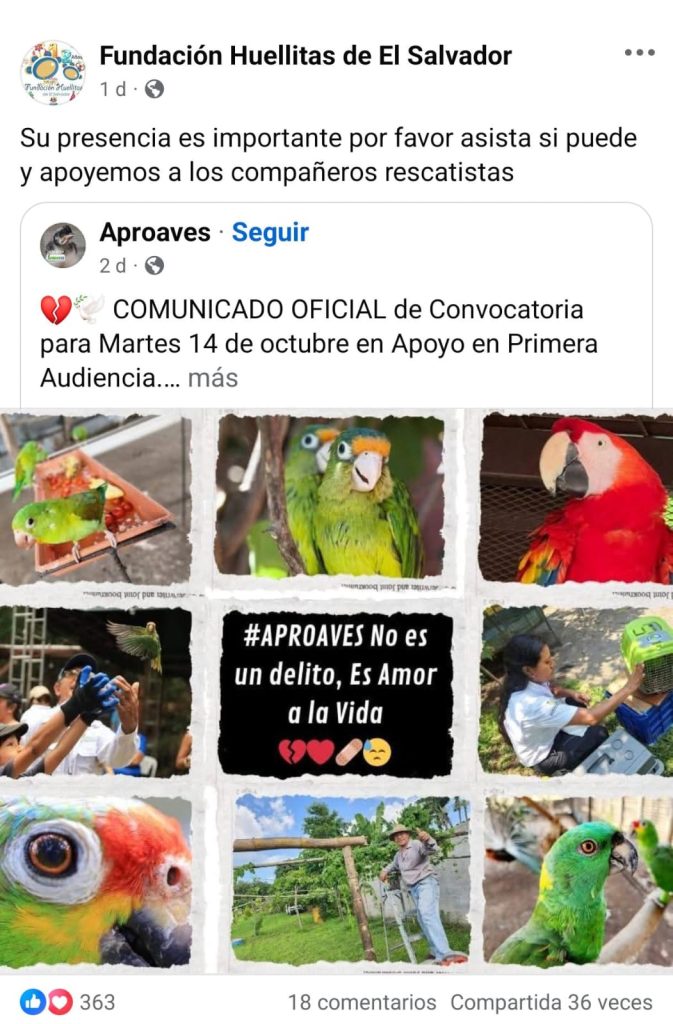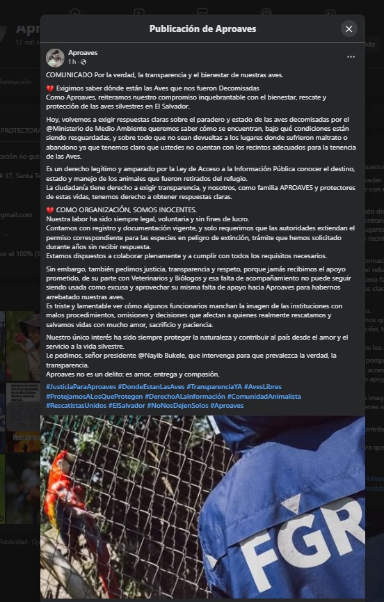 Pese a la resolución emitida durante la audiencia, APROAVES publicó un comunicado en sus redes sociales exigiendo respuestas claras sobre el paradero de las más de 200 aves incautadas el pasado 9 de octubre.