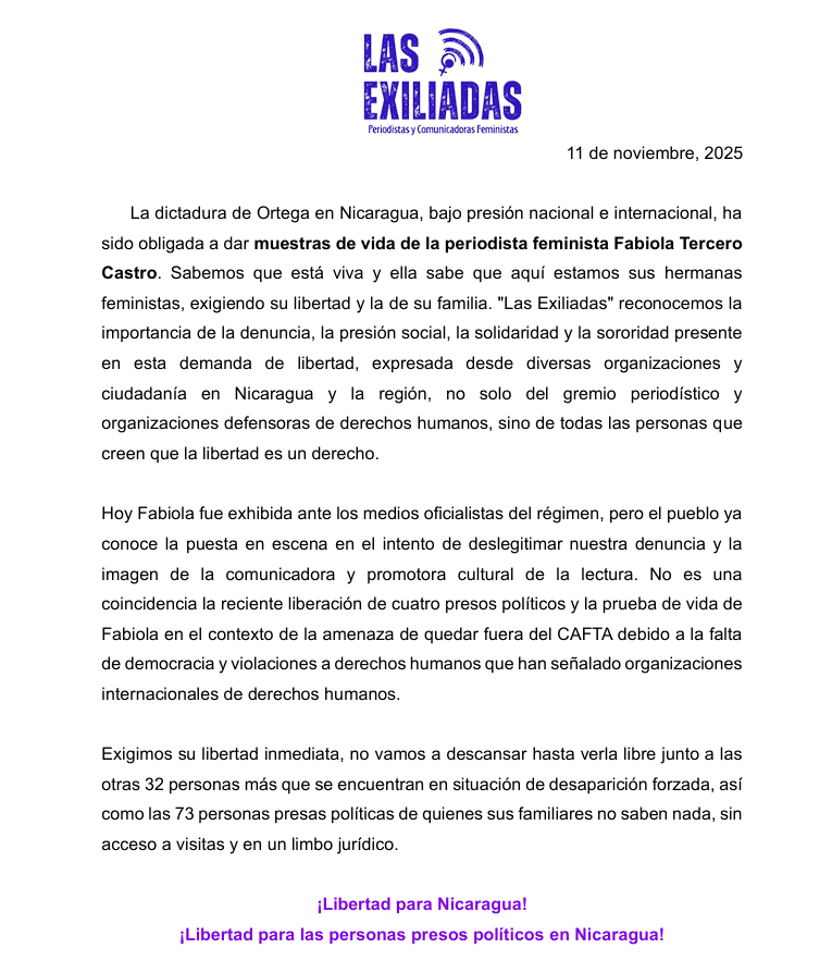 “La dictadura sandinista se vio obligada a mostrar una prueba de vida de nuestra colega” afirmó Periodistas y Comunicadores de Nicaragua (PCIN), a través de un comunicado Desde la desaparición de Fabiola, organizaciones han exigido pruebas de vida y su libertad inmediata. “No es un gesto humanitario”, agregan.