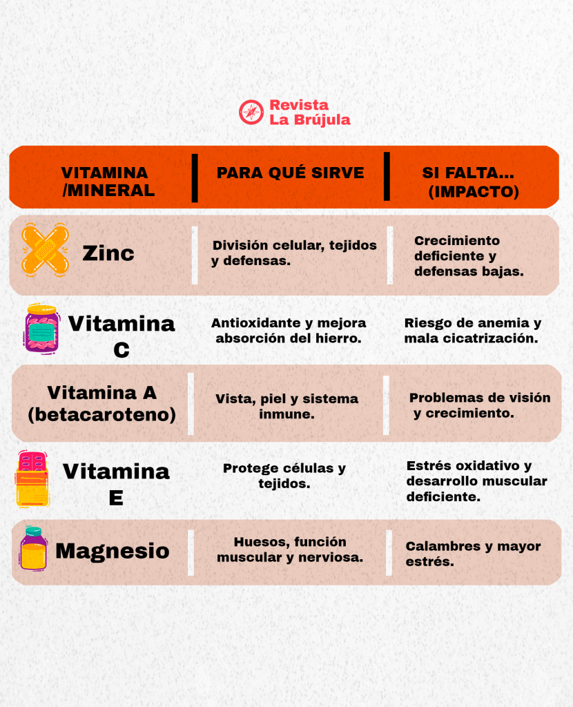 Además del ácido fólico, las multivitaminas prenatales incluyen hierro, vitaminas A, C, D y del complejo B, cada una con funciones específicas. La profesional detalló que el hierro “tiene que ver con la oxigenación de los tejidos del niñx y con la formación del sistema inmunológico y hematológico”, ayudando a prevenir la anemia fetal. El calcio y la vitamina D son esenciales para la formación de huesos y dientes, mientras que la vitamina C contribuye al desarrollo de la piel, vasos sanguíneos y tejidos musculares del feto, además de fortalecer el sistema inmunológico.