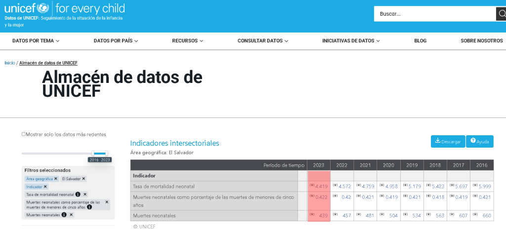 En cuanto a la mortalidad neonatal, para 2023 el Portal de Indicadores Básicos para la Región de las Américas de la OPS/OMS reportó 439 muertes neonatales, equivalentes a una tasa de 5.0 por cada 1,000 nacidos vivos. Para 2024, Diario El Salvador publicó que la tasa de mortalidad neonatal fue de 4.9 decesos por cada 1,000 nacidos vivos, lo que implica una reducción de apenas 0.1 puntos entre ambos años.