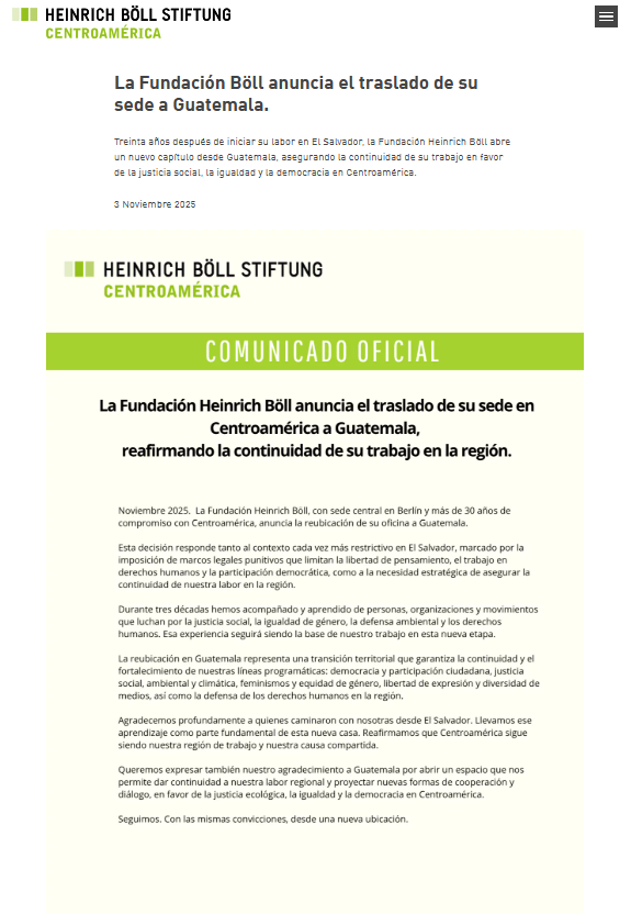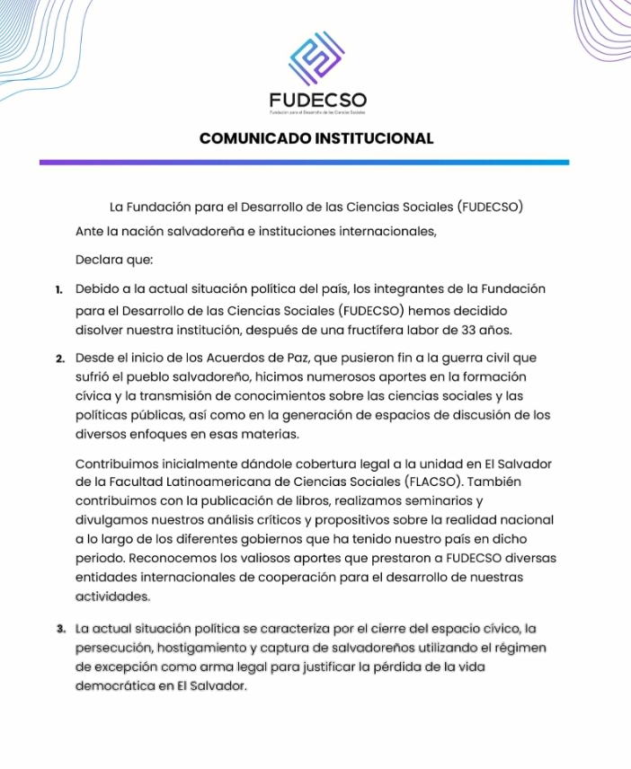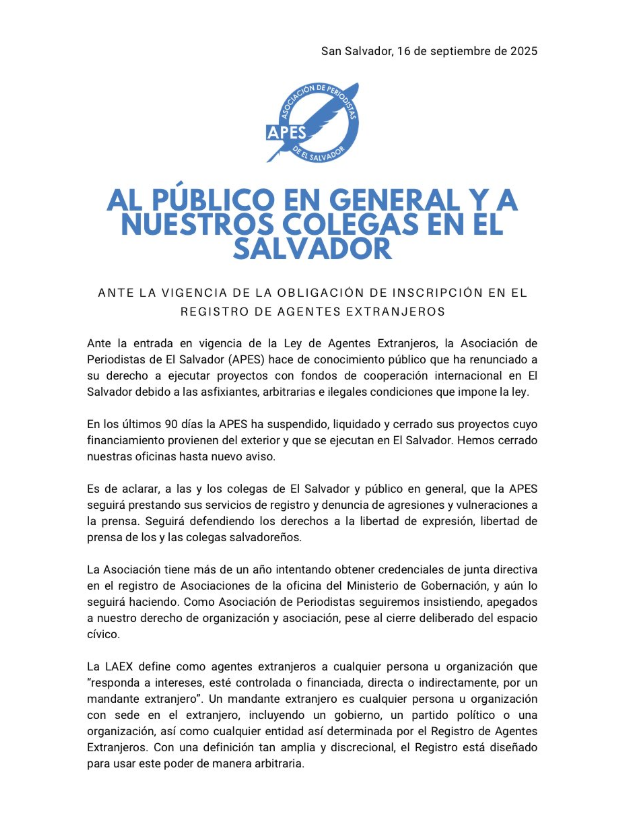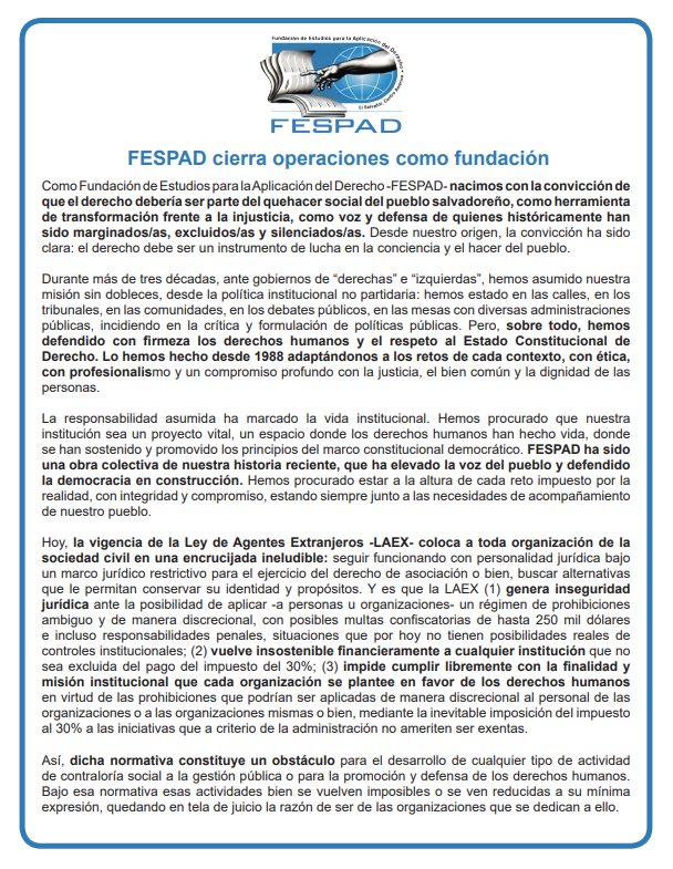 Entre las instituciones que anunciaron el retiro de sus operaciones se encuentran FESPAD, CRISTOSAL, Asociación de Periodistas de El Salvador, la Fundación Heinrich Böll, así como otras organizaciones que históricamente habían trabajado en derechos humanos, fortalecimiento democrático, juventudes, programas comunitarios de salud, prevención y atención de violencia contra las mujeres y comunidades rurales fueron recortados o suspendidos, lo que generó preocupación por el impacto directo en poblaciones vulnerables y por el debilitamiento de la cooperación internacional en El Salvador.