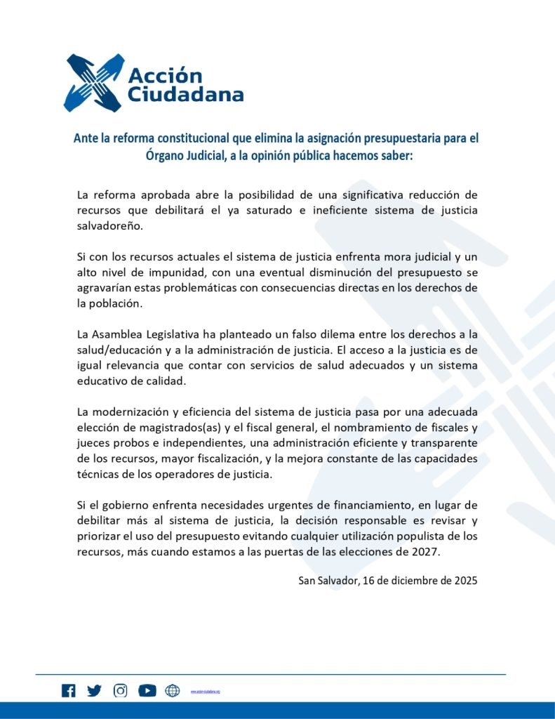 En la misma jornada, la Asamblea Legislativa también aprobó, bajo el mismo mecanismo de dispensa de trámite, una reforma constitucional que elimina el porcentaje mínimo de los ingresos corrientes del Estado destinado al presupuesto de la Corte Suprema de Justicia (CSJ), modificando una garantía presupuestaria histórica para el órgano judicial.