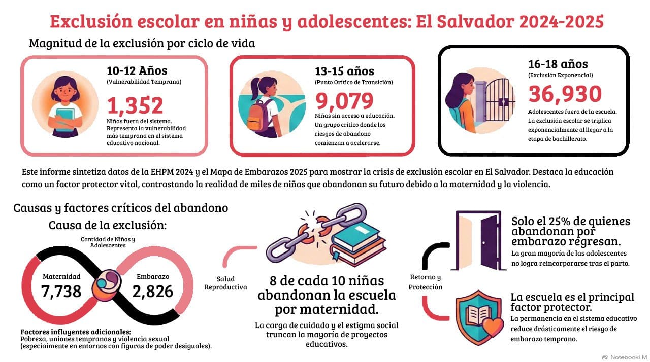 El embarazo y la maternidad figuran entre las causas de exclusión escolar de niñas y adolescentes en El Salvador// Fuente: EHPM, 2024. (Elaborado con apoyo de herramientas de inteligencia artificial, revisado y verificado por el equipo editorial).