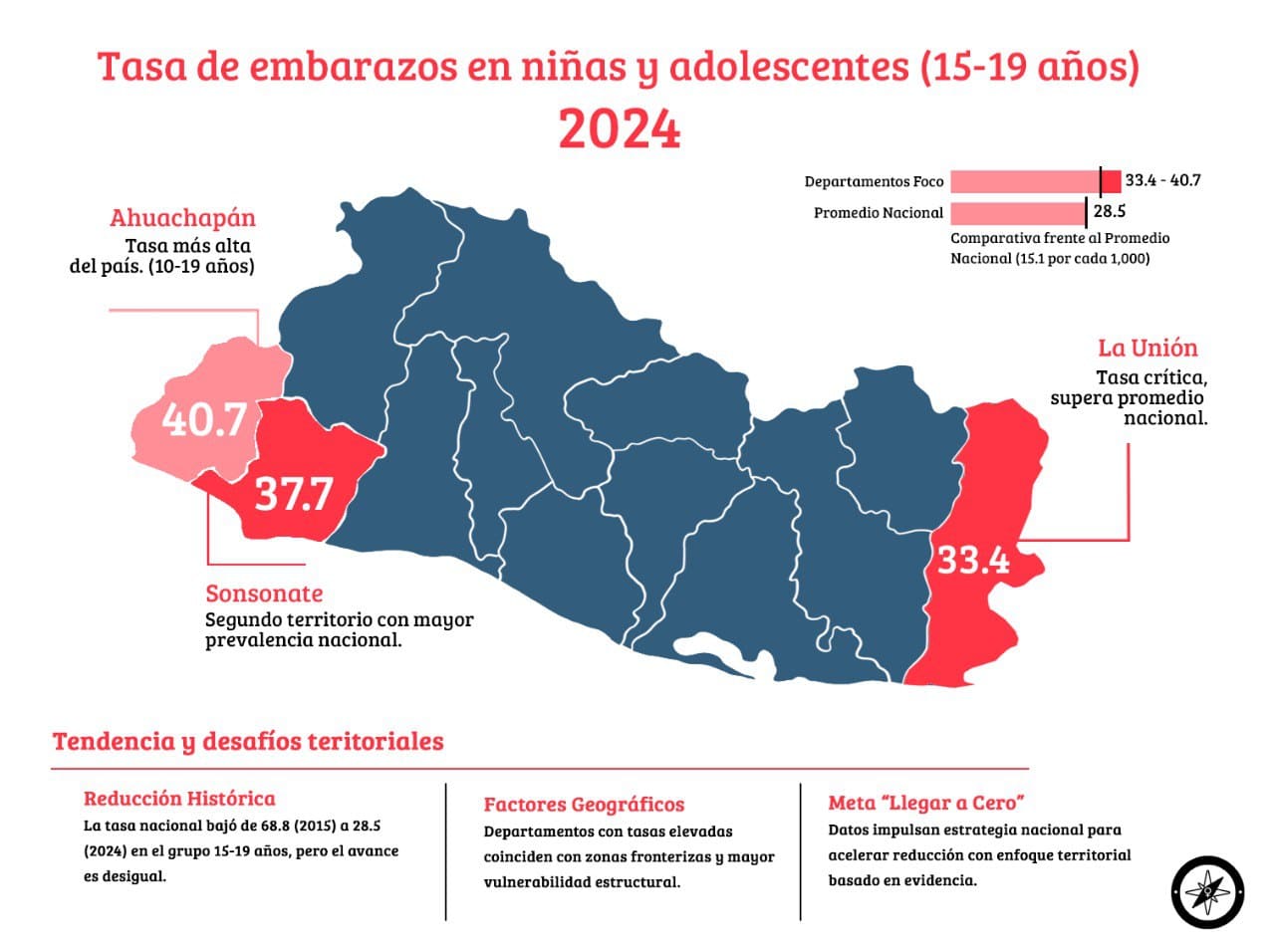 El mapa de embarazos en niñas y adolescentes del Fondo de Población de las Naciones Unidas (UNFPA) para el periodo 2024-2025 ubica a los departamentos de La Unión, Ahuachapán y Sonsonate entre los territorios con mayores tasas de embarazos. Solo para 2024 se registraron 7,900 embarazos en niñas y adolescentes, un promedio de 21 casos diarios.