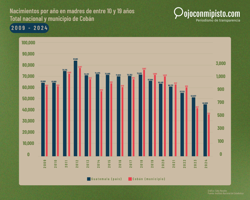 En Cobán, el municipio con tasas más altas después de la capital, la cifra de nacimientos en menores de 20 años fue de 1 mil 23 en 2020 según datos del Instituto Nacional de Estadística (INE) y en 2024 se había reducido a la mitad: 512.