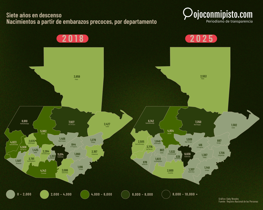 Paradójicamente, es el mejor resultado que el país ha cosechado. El año pasado, según el Registro Nacional de las Personas (Renap), el número de nacimientos en madres de entre 10 y 19 años fue de 56 mil 889, la mayoría de ellos en los departamentos de Alta Verapaz y Guatemala. Tres años antes, en 2022, la cantidad fue de 67 mil 688. En 2018 se registraron 77 mil 700. En siete años, Guatemala ha reducido un 26.8 % los nacimientos resultado de embarazos precoces.