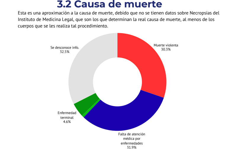 En el informe se detalla que las principales causas de muerte son la negligencia médica 31.9 % y las muertes violentas 30.3 %. Un 4.6 % corresponde a enfermedades terminales, mientras que en el 32.5 % de los casos no hay información concluyente.